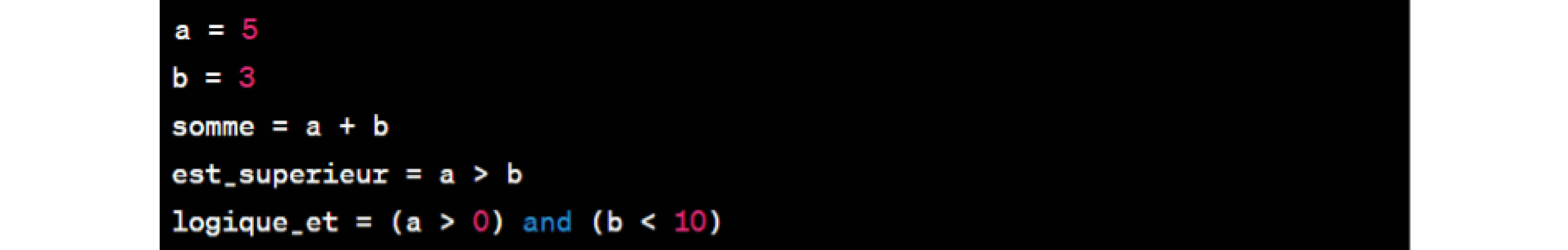 Les opérateurs arithmétiques (+, -, *, /, %), de comparaison (==, !=, <, >, <=, >=) et logiques (and, or, not) sont couramment utilisés pour manipuler les valeurs.