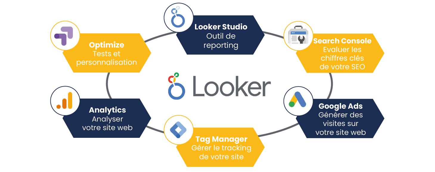 Looker Studio est interconnecté avec les applications dans l’écosystème Google Workspace. Une galaxie d’applications gravite autour. Pour citer les principales :